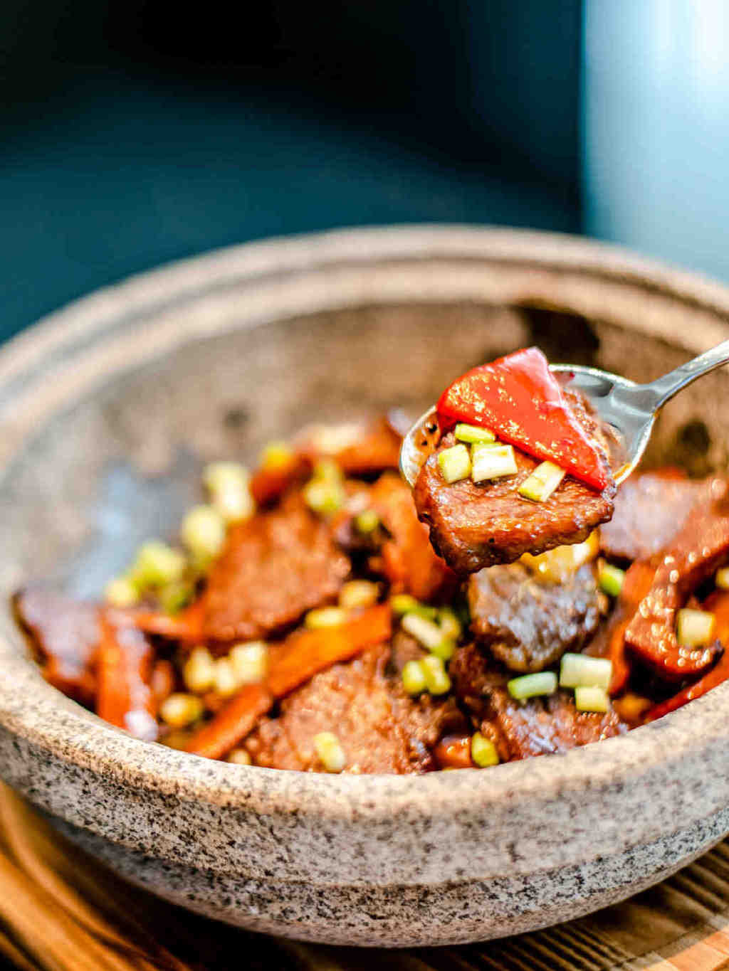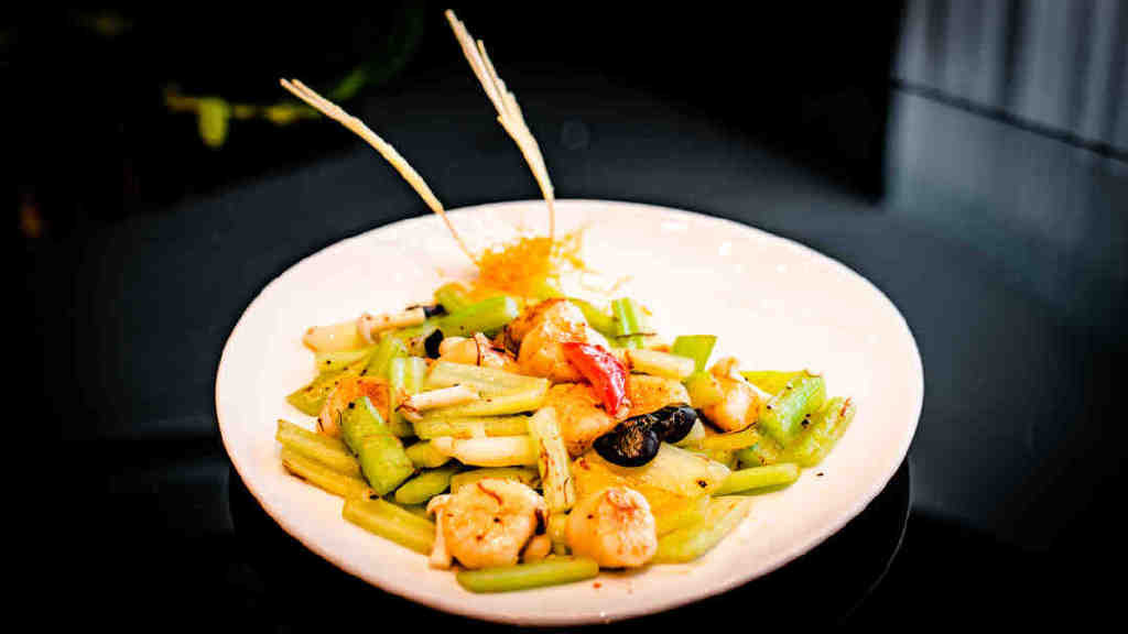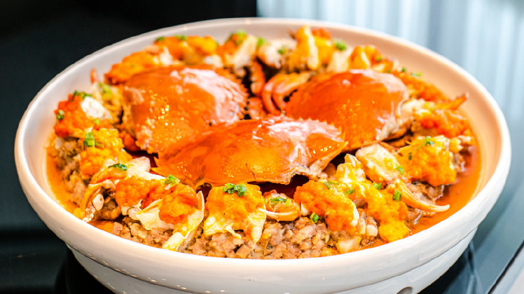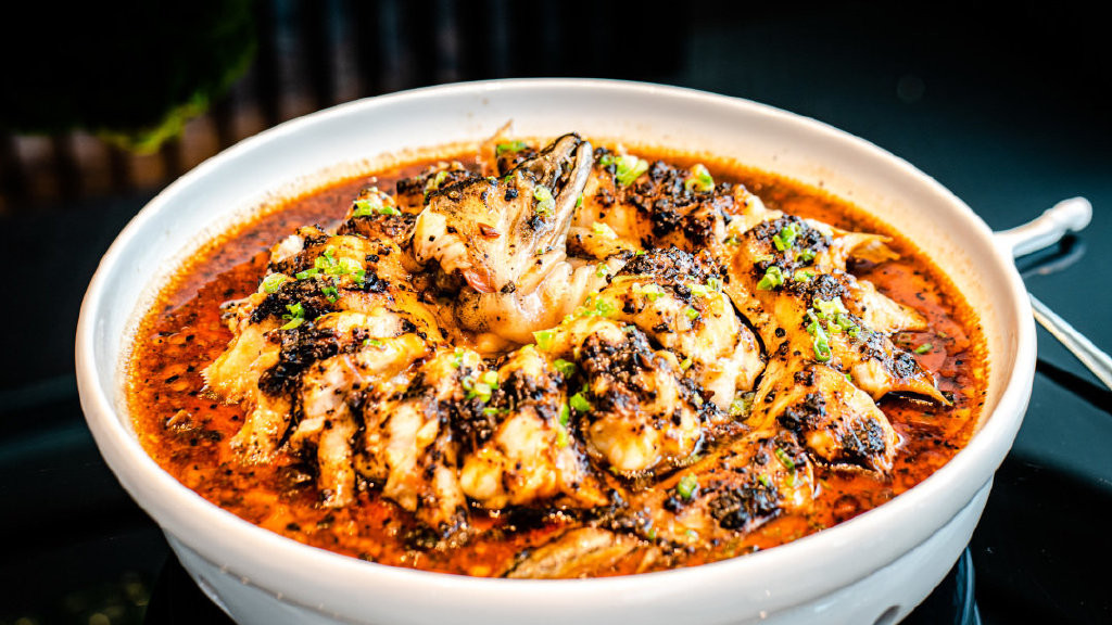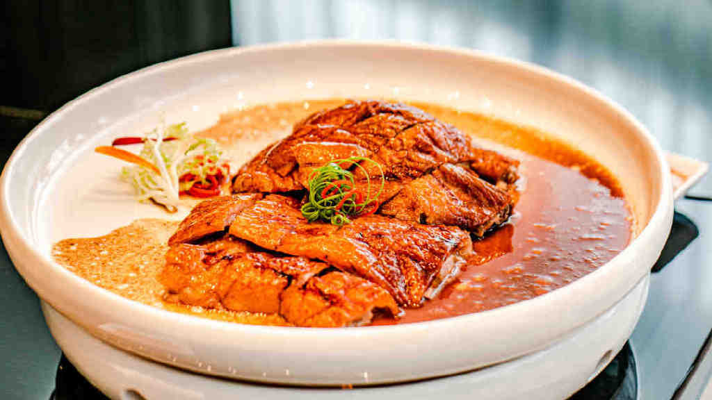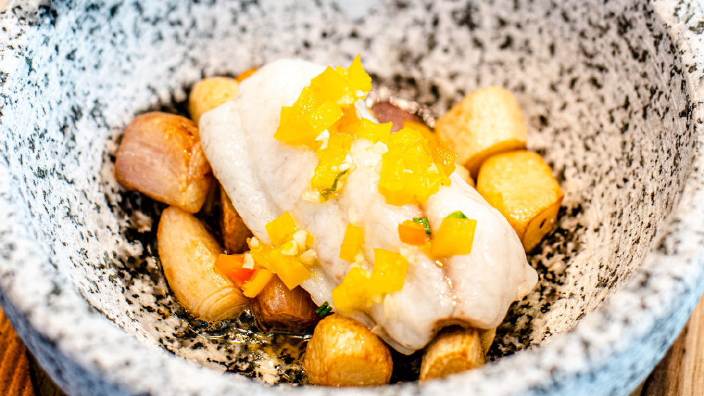 接下来的餐品每一道都让我眼前一亮,食指大动。比如这烟熏脆皮咸草鸡拼爽口话梅南瓜和竹笙蛋瑶柱炖鲜螺片,以及连蔡澜都赞不绝口的黄脚立做成的这道石锅黄椒酱焗黄脚立。