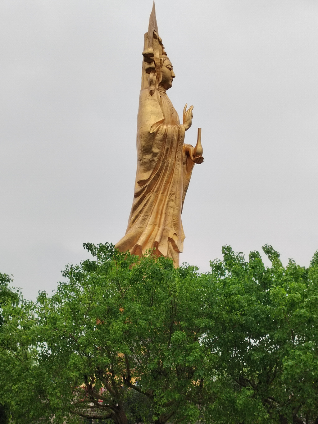 “望海观音”宝像由何厚铧首倡,高40.88米,用120吨铜铸成,外贴180两纯金箔,1994年落成。