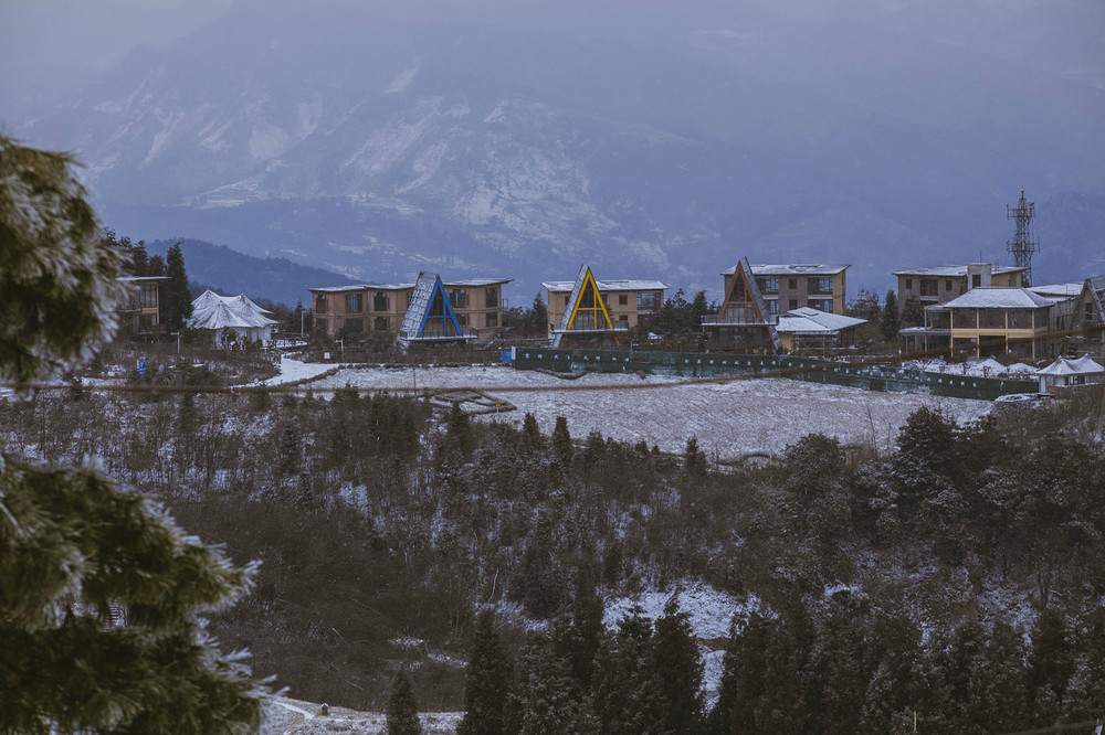 玉舍的山中颇有日系电影的画面感,远处一座座白色小雪屋散落在皑皑白雪之间,让玉舍的山中变成了雪国里的梦幻世界,漫天飘雪的时候更加有一种说不出的意境,仿佛身处梦幻般的仙境。
