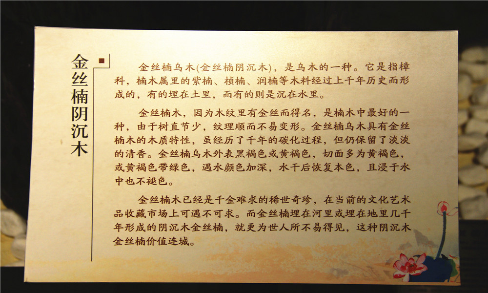 金丝楠乌木具有金丝楠木的木质特性,虽经历了千年的碳化过程,但仍保留了淡淡的清香。金丝楠埋在河里或埋在地里几千年形成的阴沉木金丝楠,就更为世人所不易得见,这种阴沉木金丝楠价值连城。