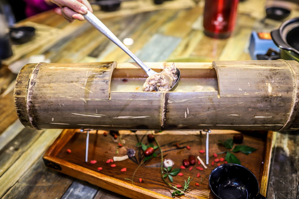 壮族竹筒鸡,以竹筒做容器制造而成,在制做的过程中,鸡肉吸收了鲜竹筒的清香,使鸡肉酥烂,有一股竹子的香味。竹筒鸡既有鸡肉之鲜甜,又有青竹之清香,汤色清丽,鸡肉滋嫩软糯,香飘四溢。