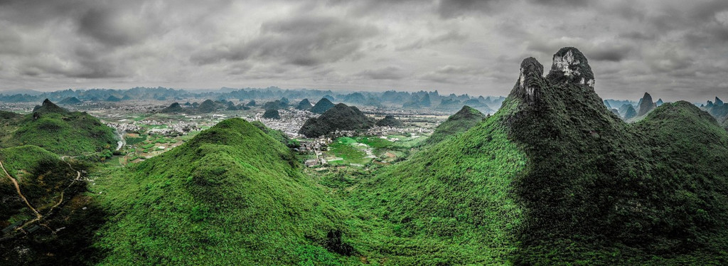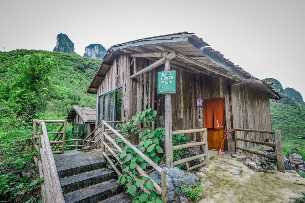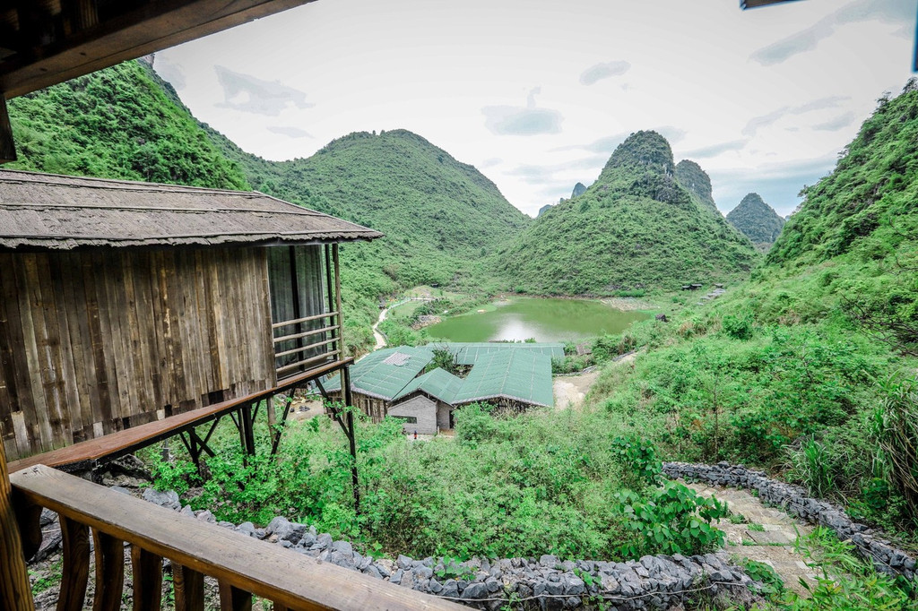 进入农庄前,会先经过一段非常陡峭的碎石山路,快到庄园大门前,望向山下的村庄和远处的喀斯特峰林起伏连绵,绿意和山花点缀,呈现出生机勃勃的面貌。