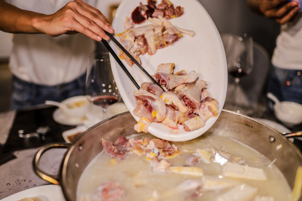 吃完黑鱼后,接着再将土鸡放锅中。 阳朔 这里都是山中放养的走地鸡,养足90天,吃起来特别有鸡味。
