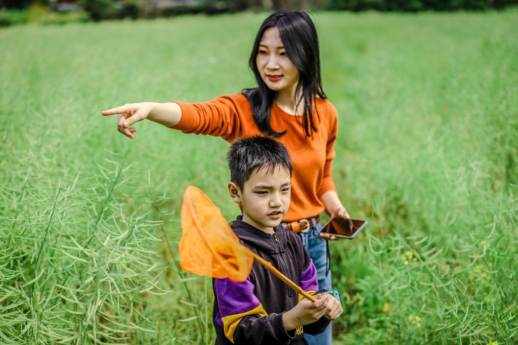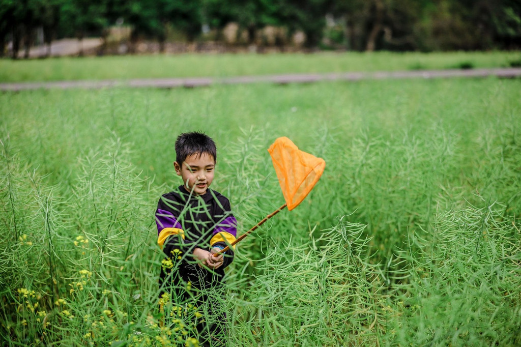 走近一片油菜花田,只见彩蝶飞舞,儿子拿起网杆追逐着蝴蝶,好不惬意。