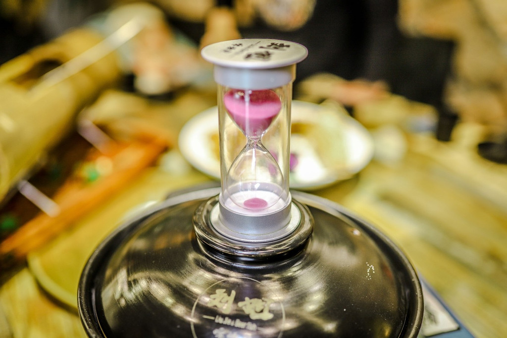 接下来,现场倒入特调的酱料包,加入啤酒,加上盖子,放上一个沙漏,当沙漏里的沙子漏完,鱼也就熟了。整个过程大约需要8分钟。