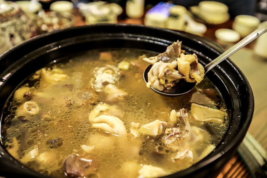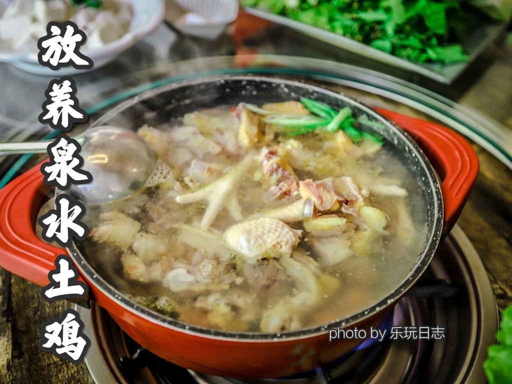 来青江渡必吃的放养泉水土鸡,山间正宗的土鸡,拔毛切块后,直接端上桌,现煮现吃,山林里长大的鸡飞来飞去,运动肌发达,皮紧肉嫩,鸡味浓郁。