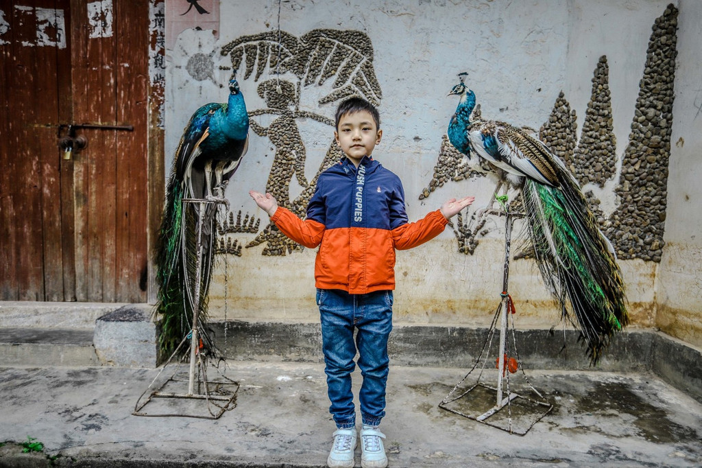 从我们入住的后院旅舍出来,沿河而行,2分钟即可到达刘三姐的故居。门口站有两只孔雀。