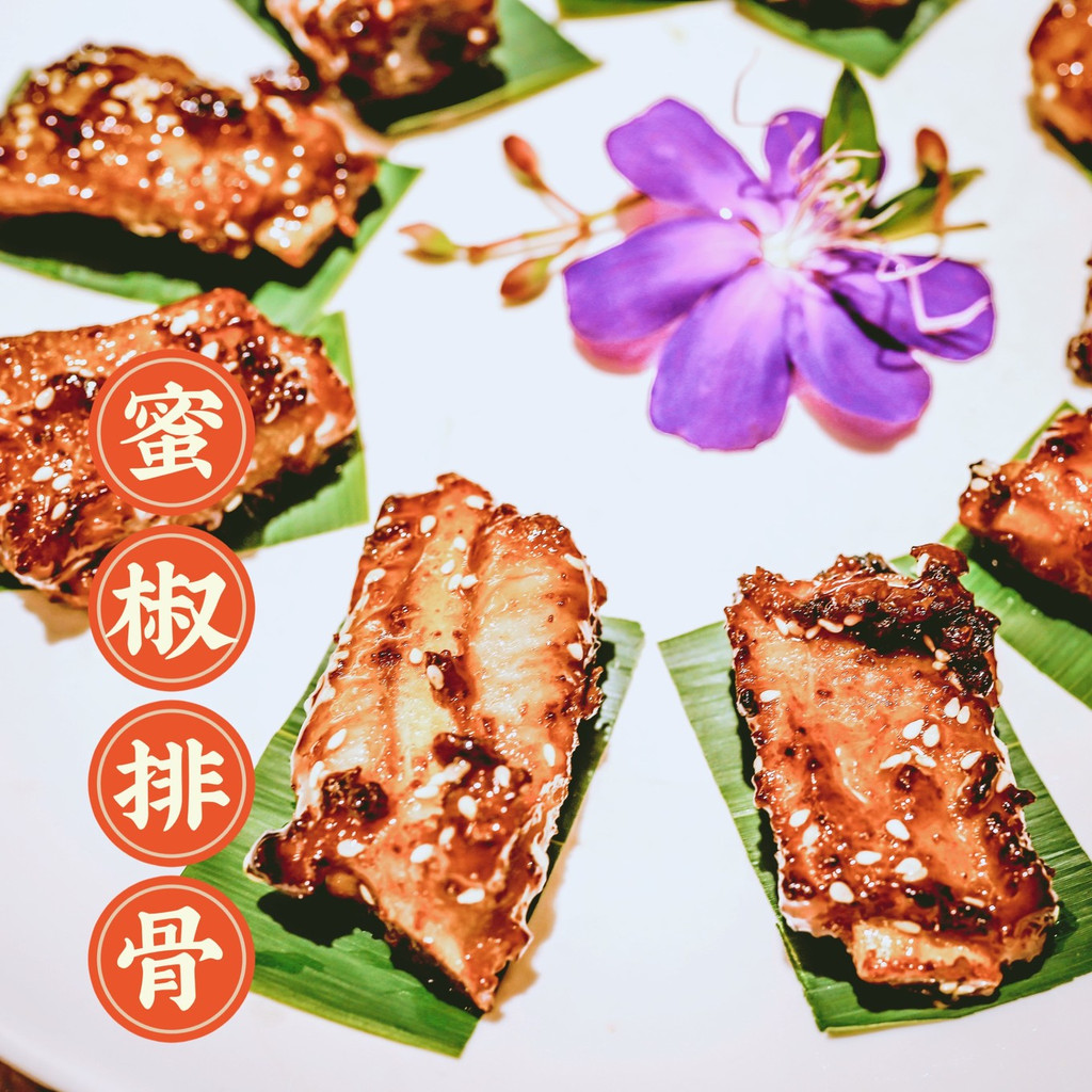 蜜椒排骨,排骨油炸后,淋上芝麻,下面用巴蕉叶盛着,摆盘和色泽都超级完美!外香里嫩!颜值和口味都是一级棒