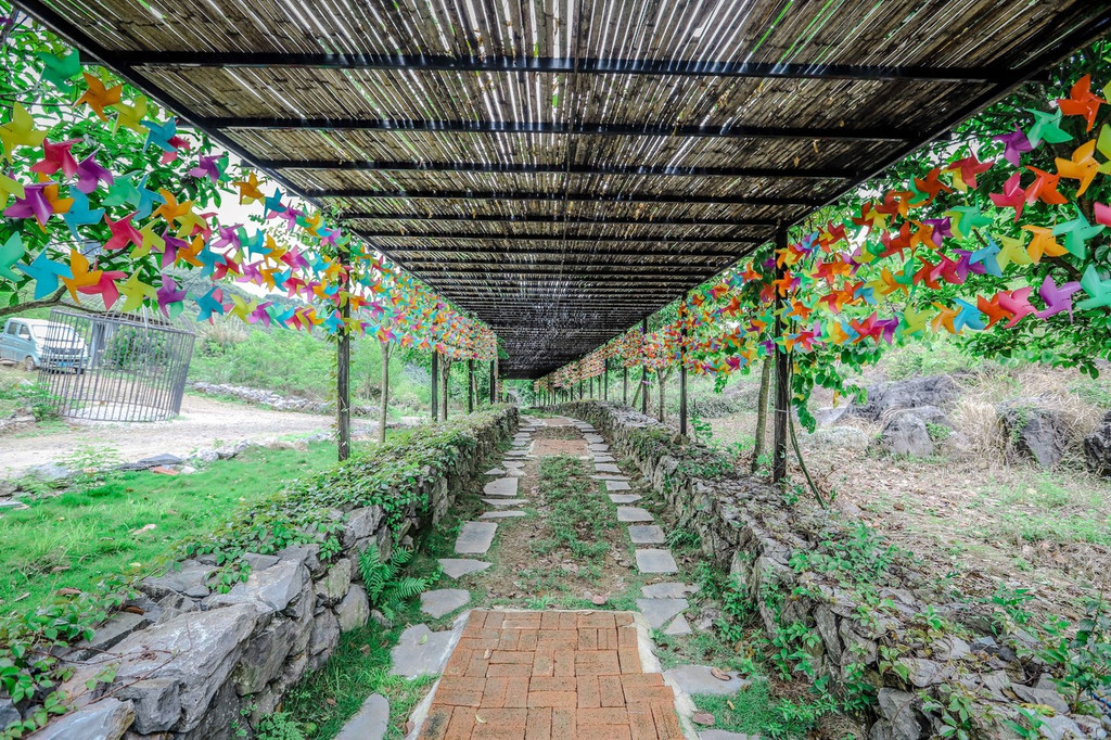 车只能停在农庄大门外,进入农庄要穿过一条长长的回廊,两边都是七彩风车,路上的空气夹杂着青草的味道,让人心旷神怡。