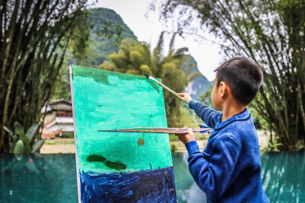 桂林 山水为户外绘画提供了得天独厚的创作素材,小朋友可以自由创作出属于自己的作品。