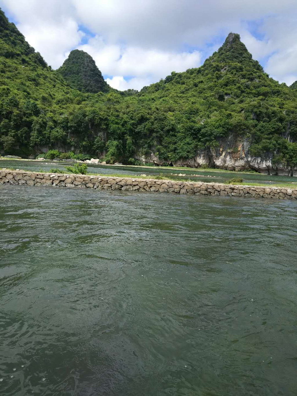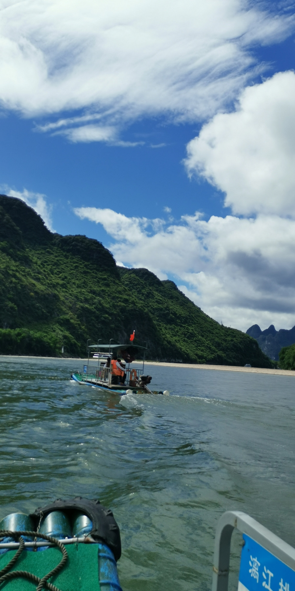 我们坐在竹筏上,微风迎面吹来,风儿吹佛着我们的面庞,吹走了身上的燥热,精神也为之一振。我们的竹筏像一片树叶在漓江上轻盈的漂流,隐隐的青山扑面而来,水面上不时有小船插肩而过,次时此刻真像身处世外桃源。这时又让我想起那句“桂林山水甲天下,阳朔山水甲桂林”诗句,桂林最灿烂,最秀美的景色在阳朔,在阳朔的漓江上。“桂林山水甲天下”有点夸大其词,而“阳朔山水甲桂林”则是名副其实,恰如其分了。