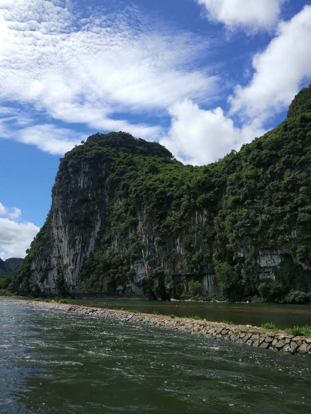 “阳朔山水甲桂林”确实名不虚传,坐在竹筏上向四下眺望,青山隐隐,碧波长流,竹筏游弋在山水间,犹如一幅真实的山水画卷。江边的山被茂密的树林包裹着,树大都是灌木或低矮的乔木,只是把山体包的严严实实,而不改变山的轮廓。千姿百态的山依旧保持着原来的形状,有的如奔马,有的如飞龙;有的像仙女,有的似顽童。任由人们去想象,任由人们附会出各种美妙的传说。