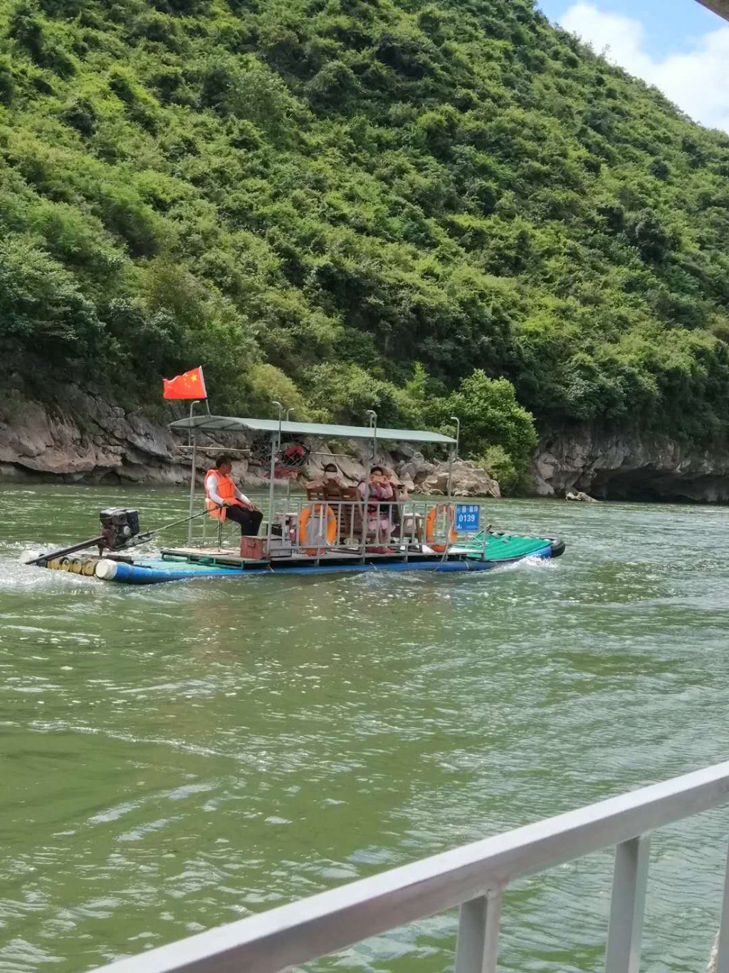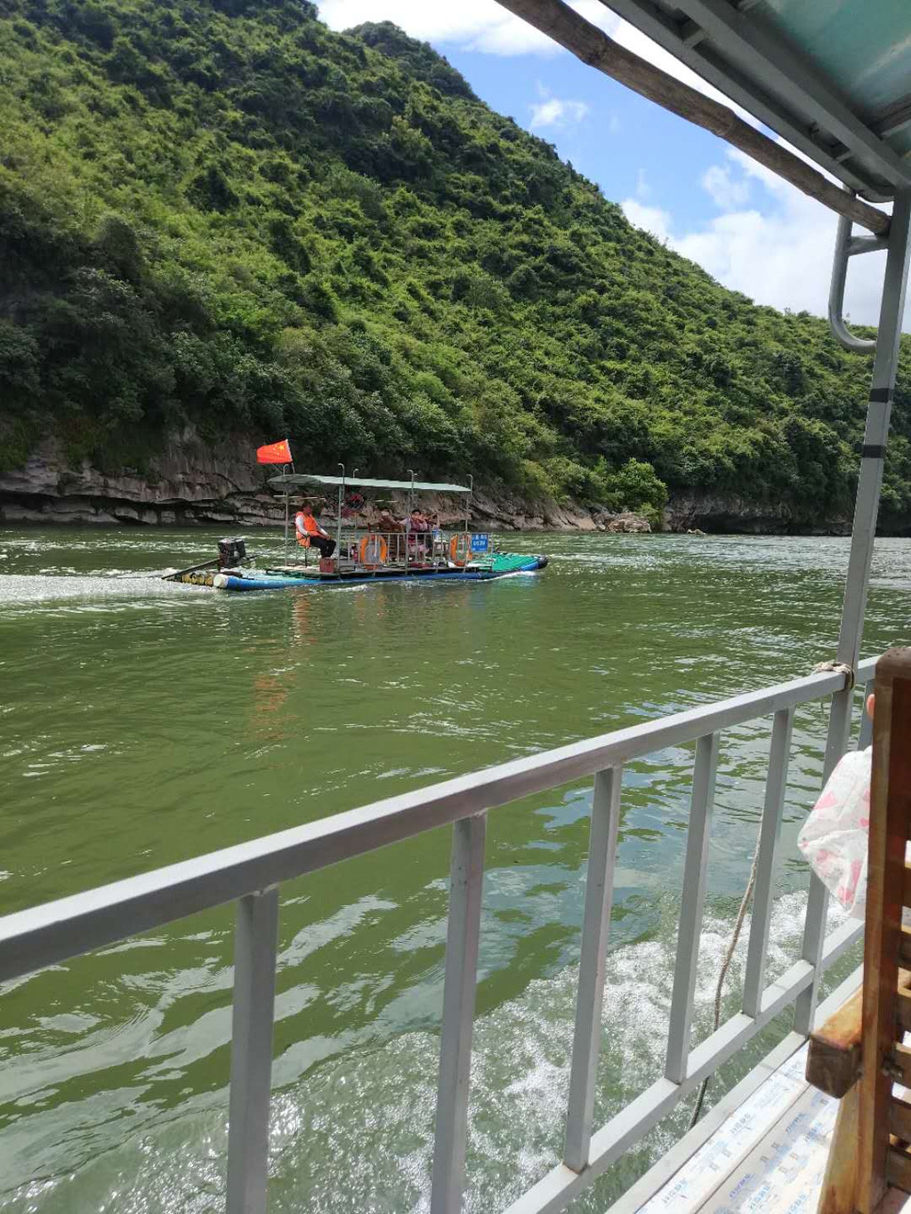 这里的竹筏不是用粗壮的毛竹捆扎而成,而是用毛竹状的塑料管状物拼接而成,准确的说是塑料筏子。筏子有栏杆有顶棚,乘坐比较舒适,也比较有安全感。筏子不是人工撑篙,是用内燃机驱动。