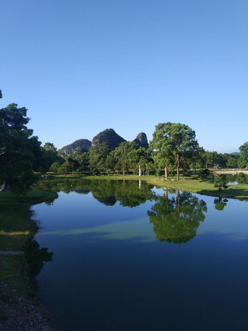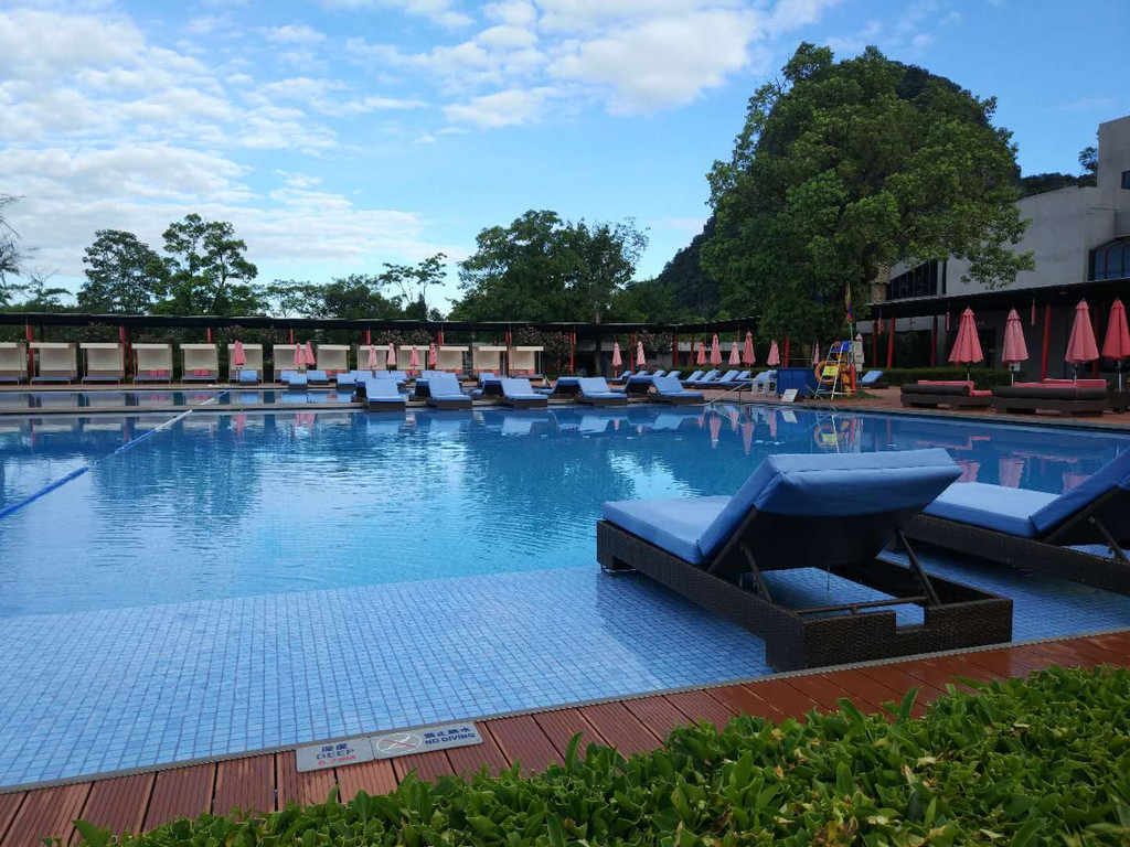 站在度假村中环顾四周,远处山峦起伏,桂林特有的圆顶山头高高低低,排列在度假村周围,成为度假村的绝佳背景;树林的墨绿和草坪翠绿让烈日下的度假村透出少许清凉;露天泳池水波荡漾,泛着湛蓝湛蓝的柔光。度假村本身就是4A级景区,景色非常棒,在我看来不亚于在其他地方看到的四星五星级的景区。