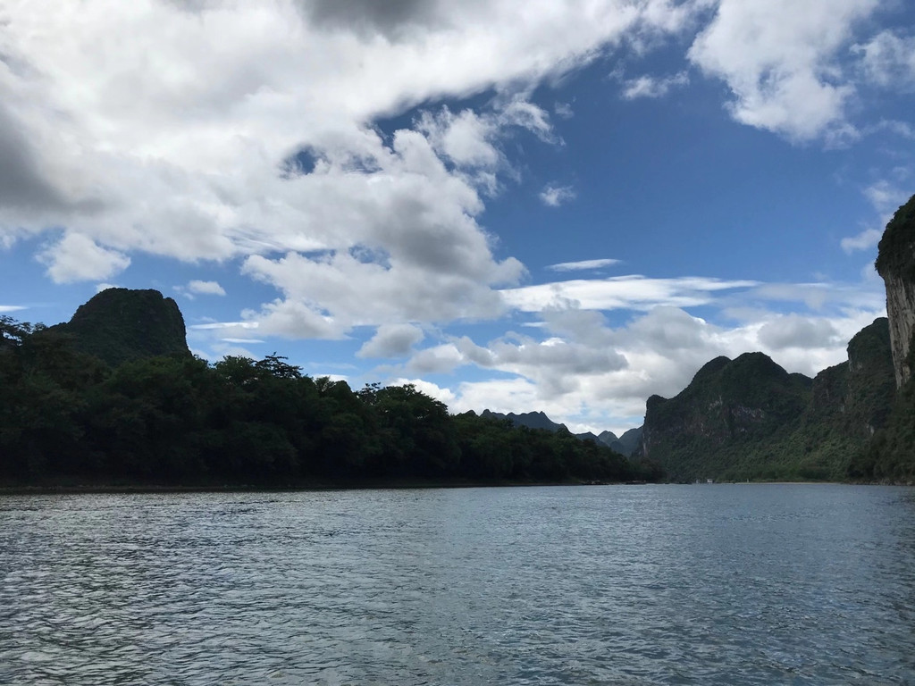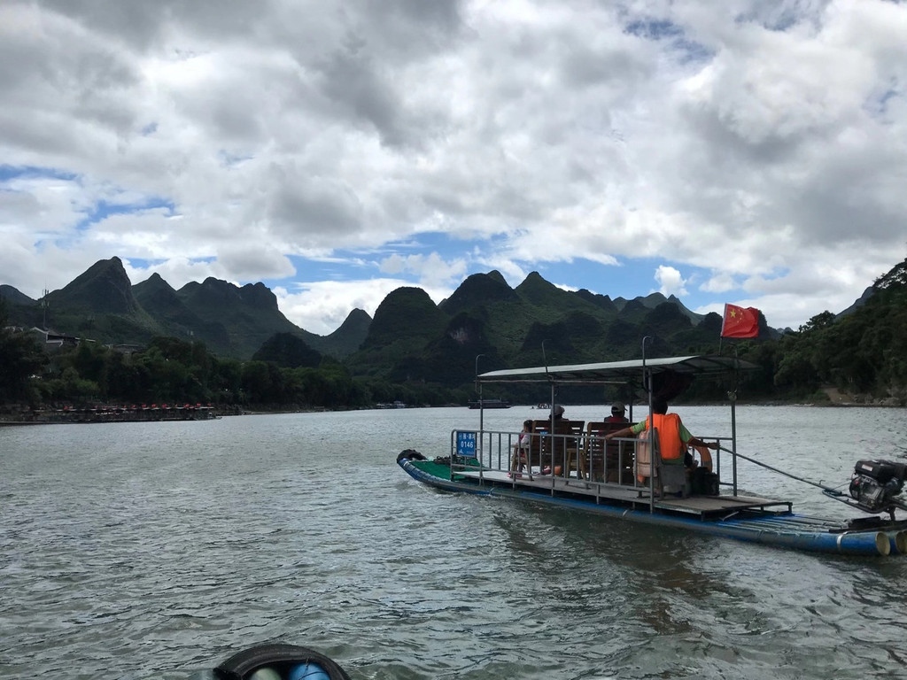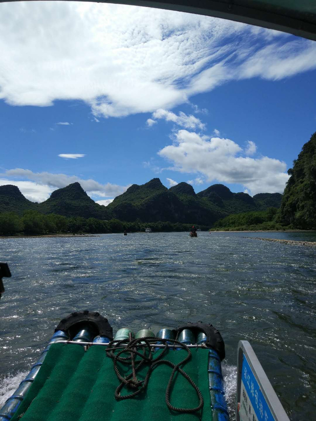桂林山水的美景总是沿着漓江铺展开的。看风景一定离不开漓江。我们在前往兴坪的途中坐上竹筏,在漓江上巡游了约一个小时。