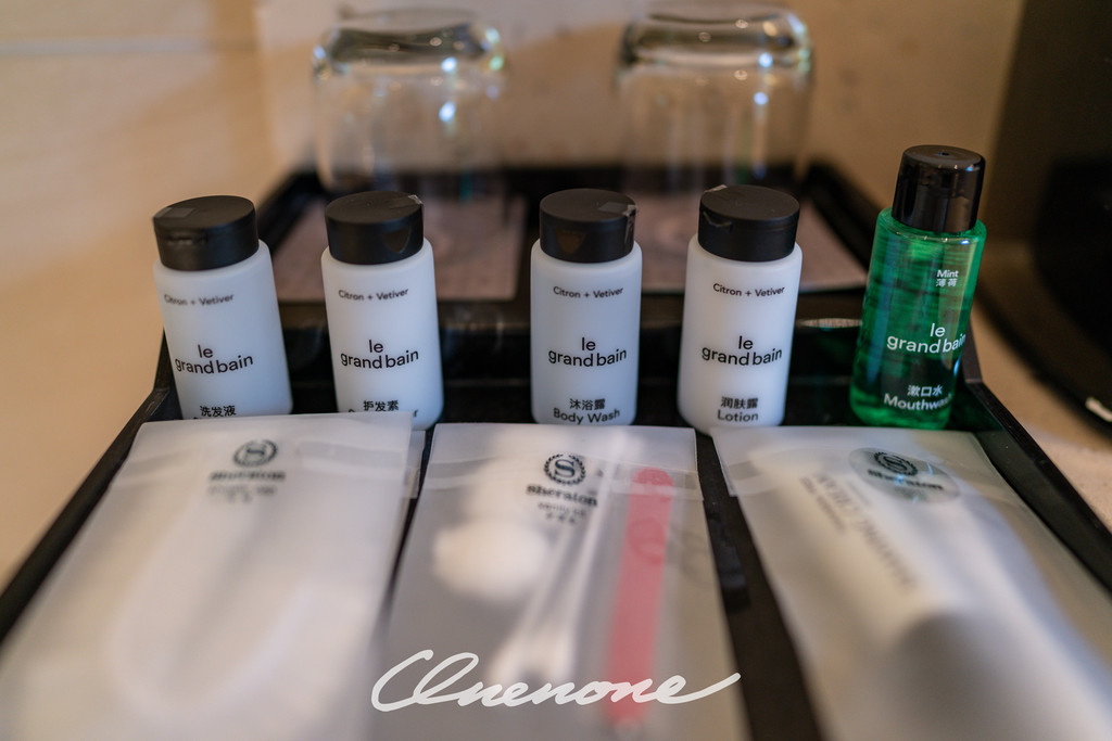 洗护备品:这套Le Grand Bain洗护备品,包括护发素、洗发水、身体乳、沐浴露和香皂,由能量精华佛手柑与平衡机体的岩兰草调制,优点在于不含防腐剂,使用感受方面的特点是清洁力和润肤感,会在不被察觉的情况下,慢慢释放和浸润身体。
