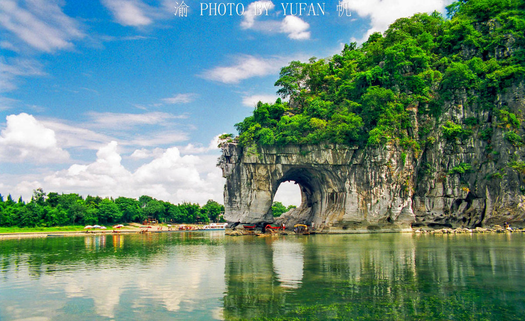 象鼻山象鼻山酷似一头驻足漓江边临流饮水的大象,栩栩如生,引人入胜,是桂林的城徽,它在桂林的地位相当于天安门之于北京、东方明珠之于上海、小蛮腰之于广州、解放碑之于重庆。山体前部的水月洞,弯如满月,穿透山体,清碧的江水从洞中穿鼻而过,洞影倒映江面构成“水底有明月,水上明月浮”的象山水月奇观。