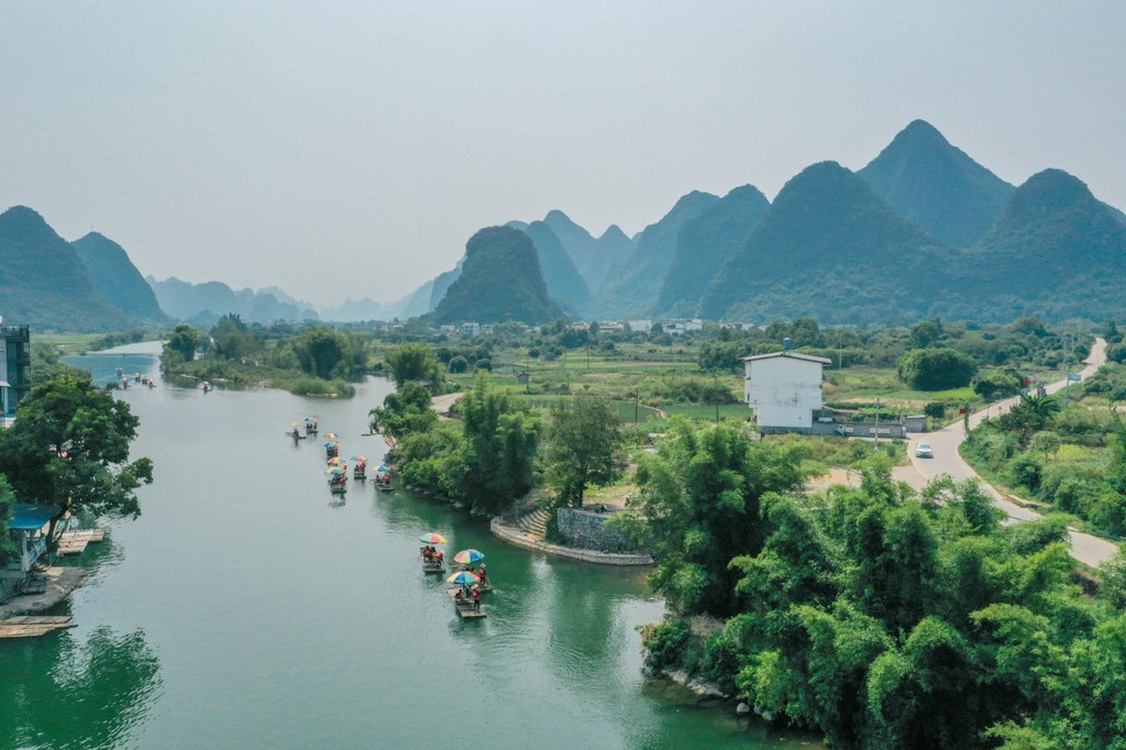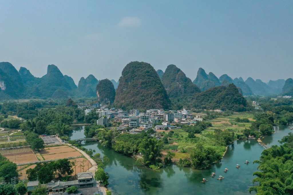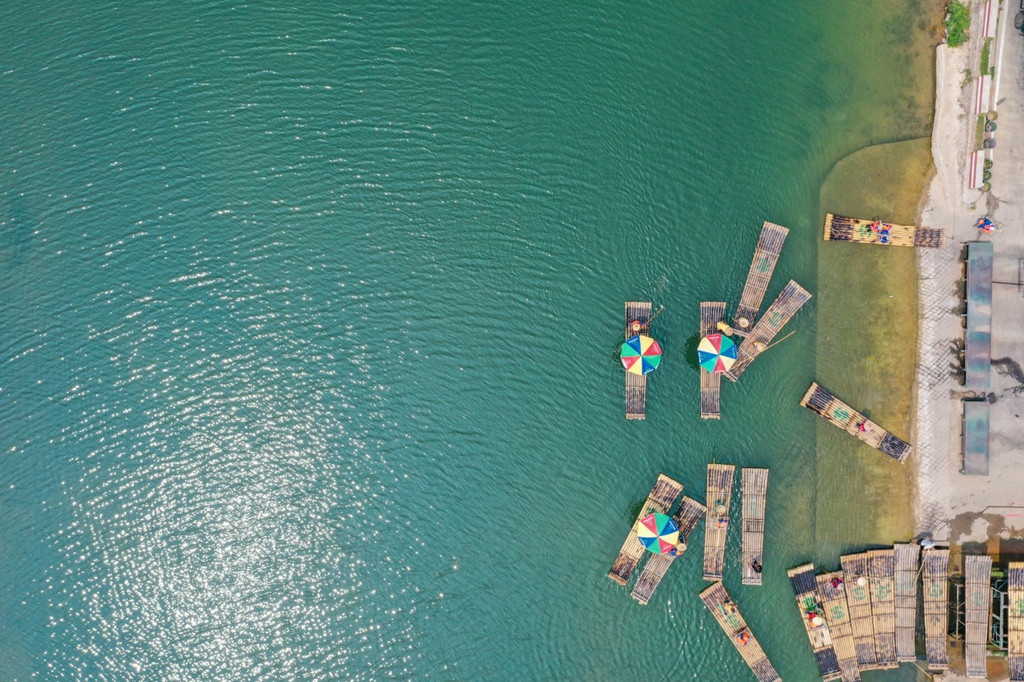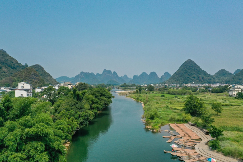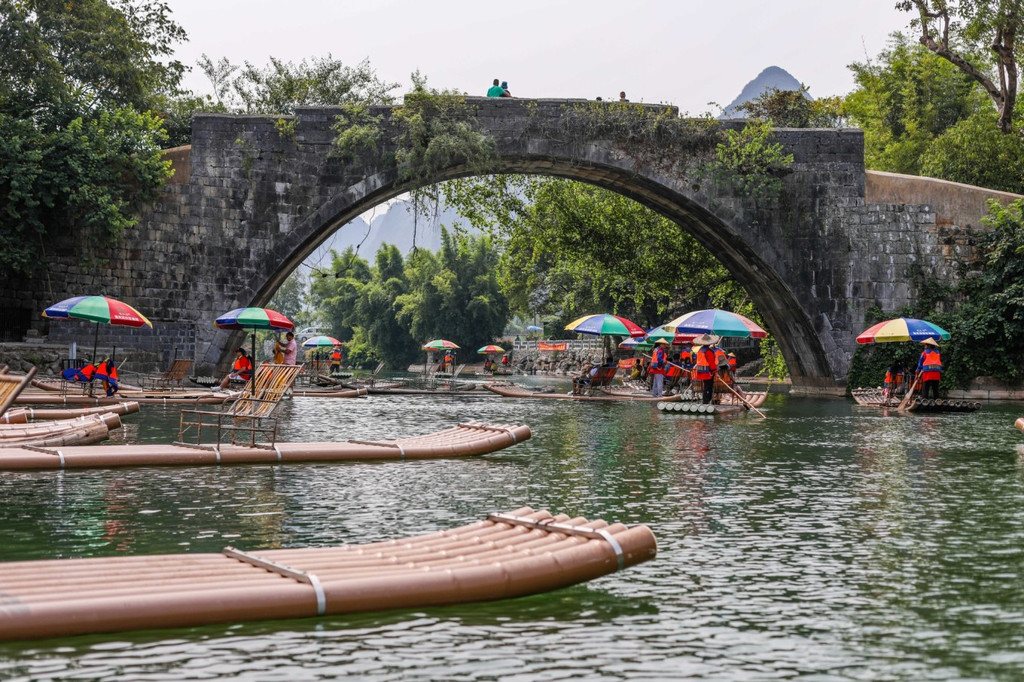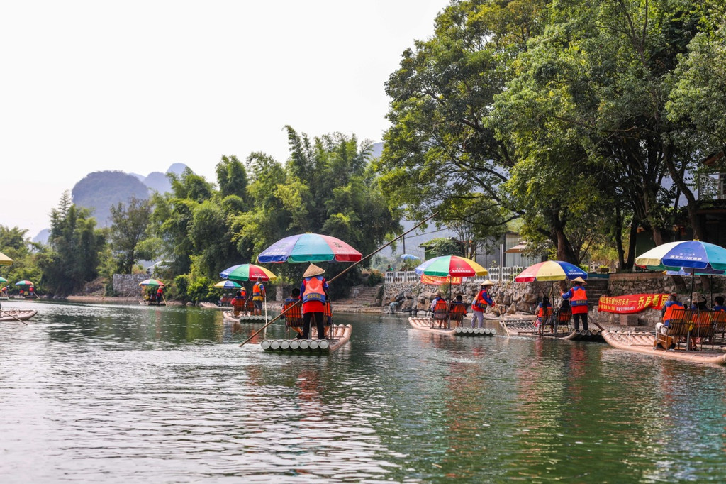 坐上竹筏,在遇龙河清澈的河水上行驶,人在画中游,竹筏也成为了画卷中的一部分。