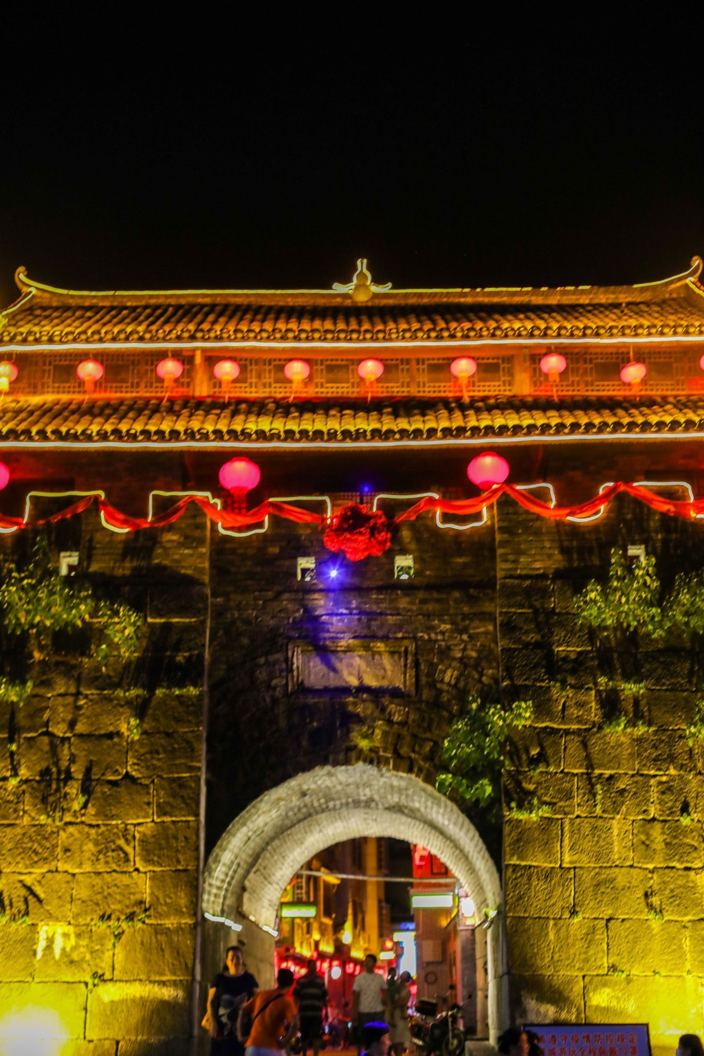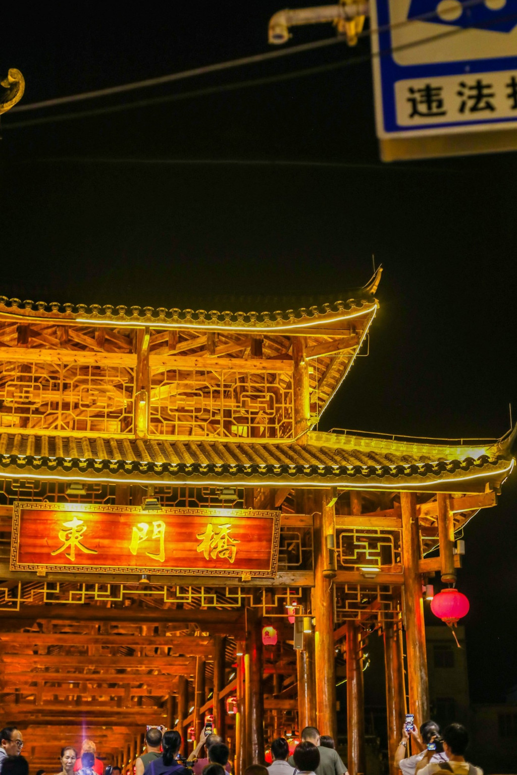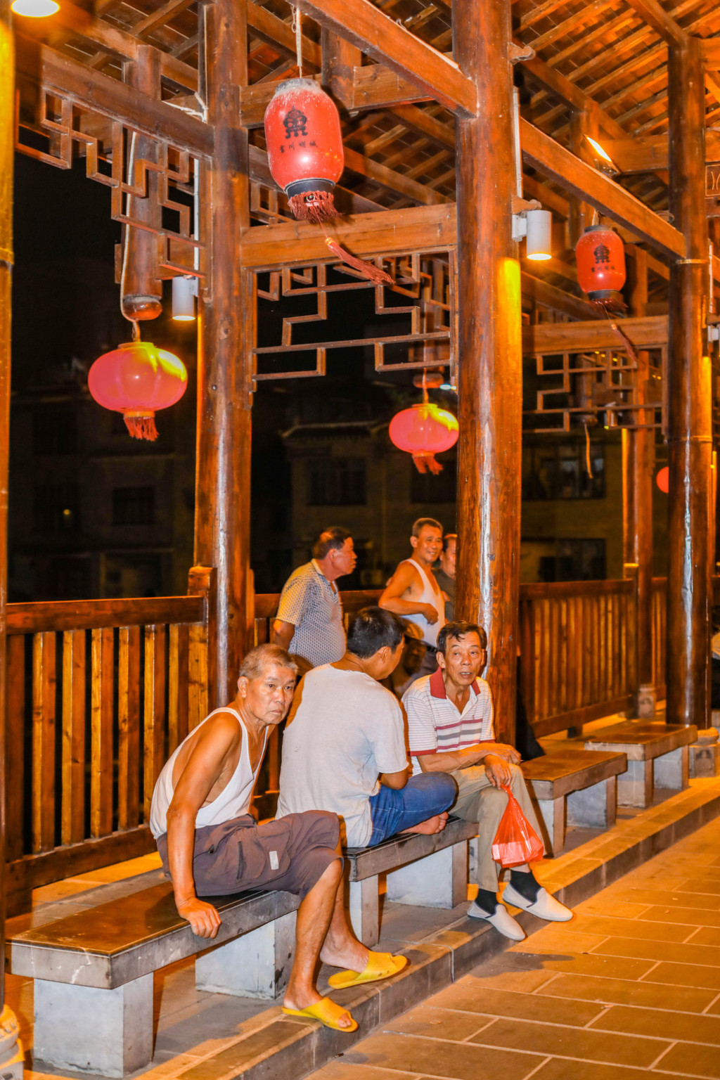 风雨桥灯光璀璨,桥上是纳凉的当地人,看着聊天的老人,嬉戏的孩子,组成了一副安宁的景象。