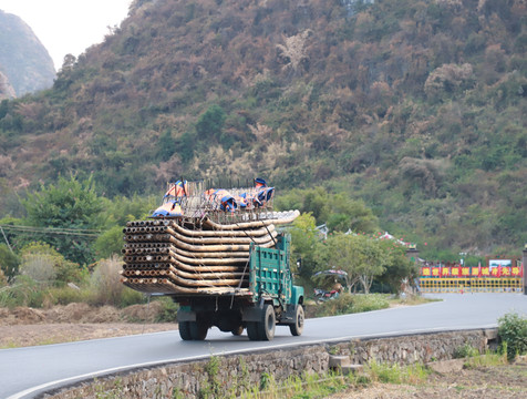 骑行第一站,遇龙河竹筏;看到工作人员正在把一艘艘竹筏放下水里。站在桥上就可以拍到,这里会有很多人停下来拍照,同时也有很多阿姨过来问要不要花串或者其他小东西。