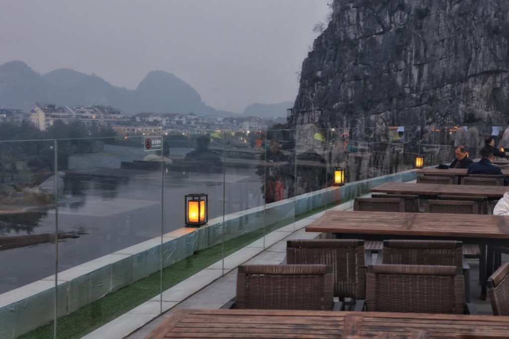 酒店大堂吧紧邻漓江,真的是名副其实的漓江院子。酒店就在波伏山景区的边上,在酒店的大堂吧坐坐,住店客人还可以免费享受茶水和小食。酒店的顶楼有一个观景平台,晚上开灯的时候,特别有感觉。
