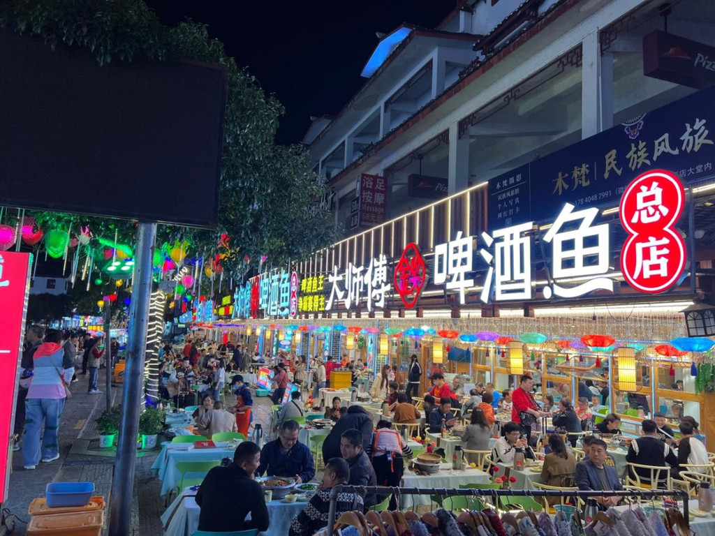 晚上我们去了有名的西街,灯火辉煌,人声鼎沸,满大街的啤酒鱼。原本觉得桂林的啤酒鱼店铺多。到了西街,发现这里的啤酒鱼店铺更多了。我们也找了一家饭店,尝了漓江小虾、田螺酿,不喜欢西街的嘈杂,饭后就回酒店了。