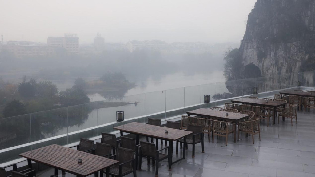 天气时阴时雨,早餐在顶楼的餐厅,烟雨濛濛的桂林山水别有一番韵味。在桂林,如果遇到阴天或者下雨天,绝对不是一个憾事,反倒是一个很值得记忆的事情。毕竟,阴雨天的桂林就好像是水墨画一样漂亮。