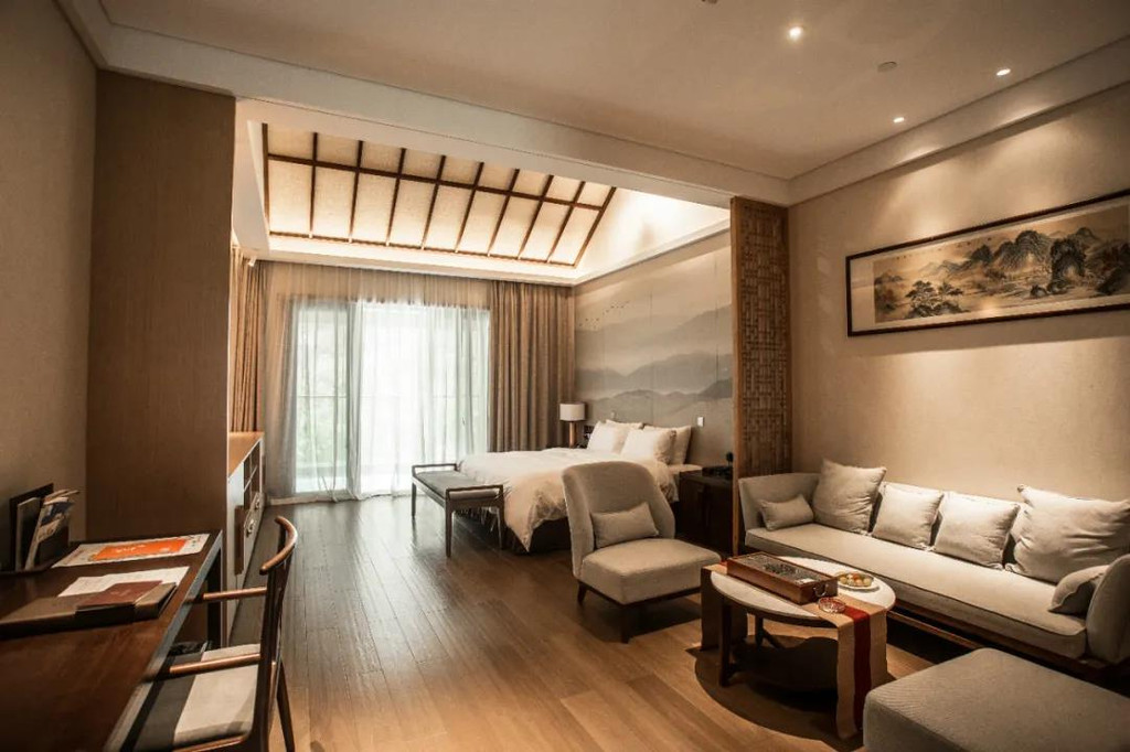 酒店每一间客房面积均达到 50 ㎡以上,隐藏于园林之中,每间房配有奢华床品、舒适会客区