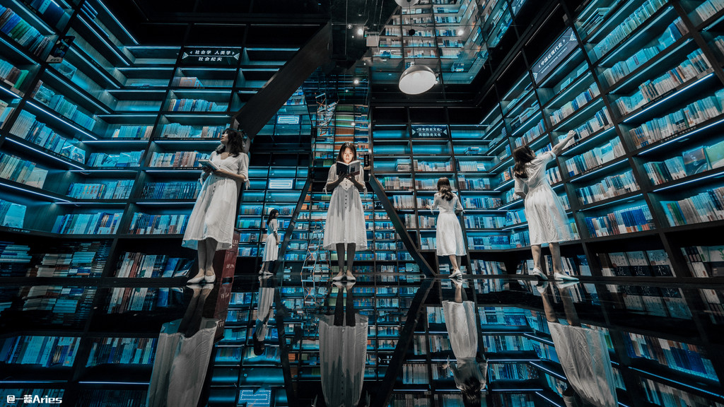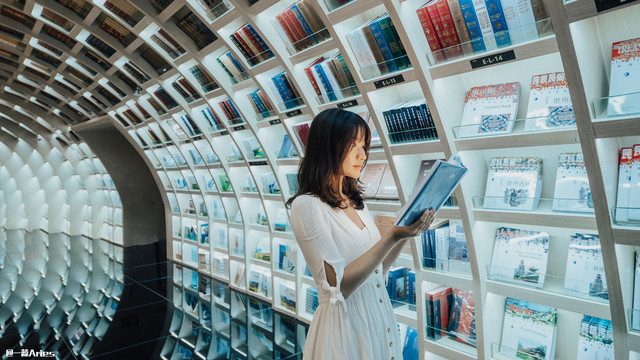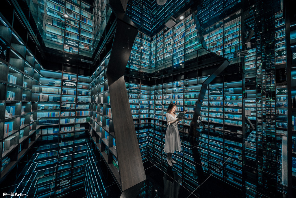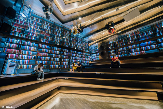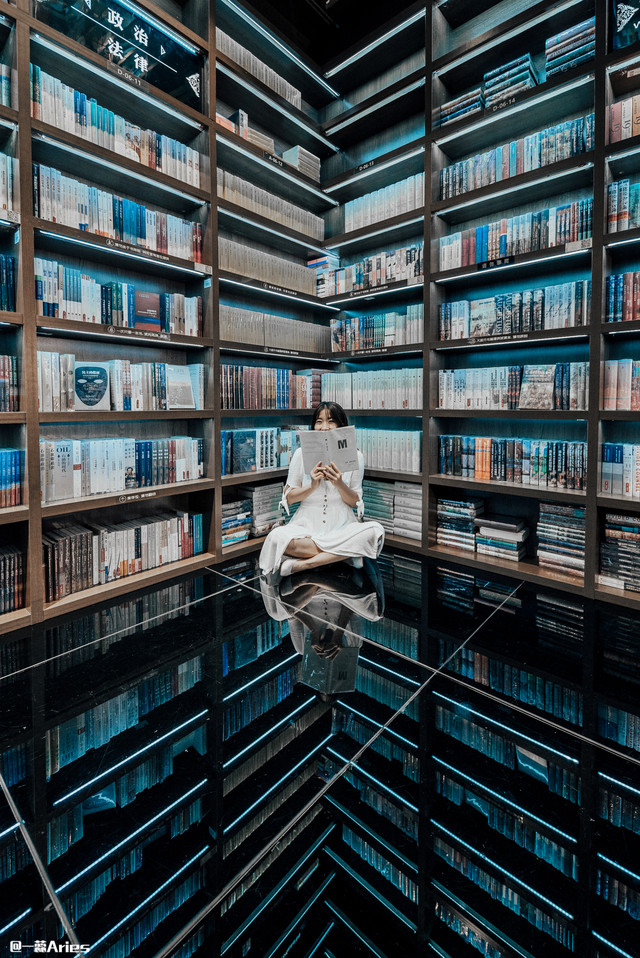 顺着光可鉴人的黑色玻璃,走入幽深的洞穴中,吊灯指引着前路,整齐的格子闪耀着微光,玲琅满目的各色书籍整齐排列其间,填满阅读者一个又一个夏日午后。