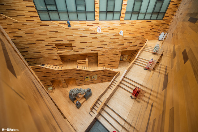 展馆内部共有三层,每一层都是不同的主题,阳光从中庭巨大的玻璃窗外洒进来,纵横交错的楼梯上光影斑驳,是历史和现实的相互交融。