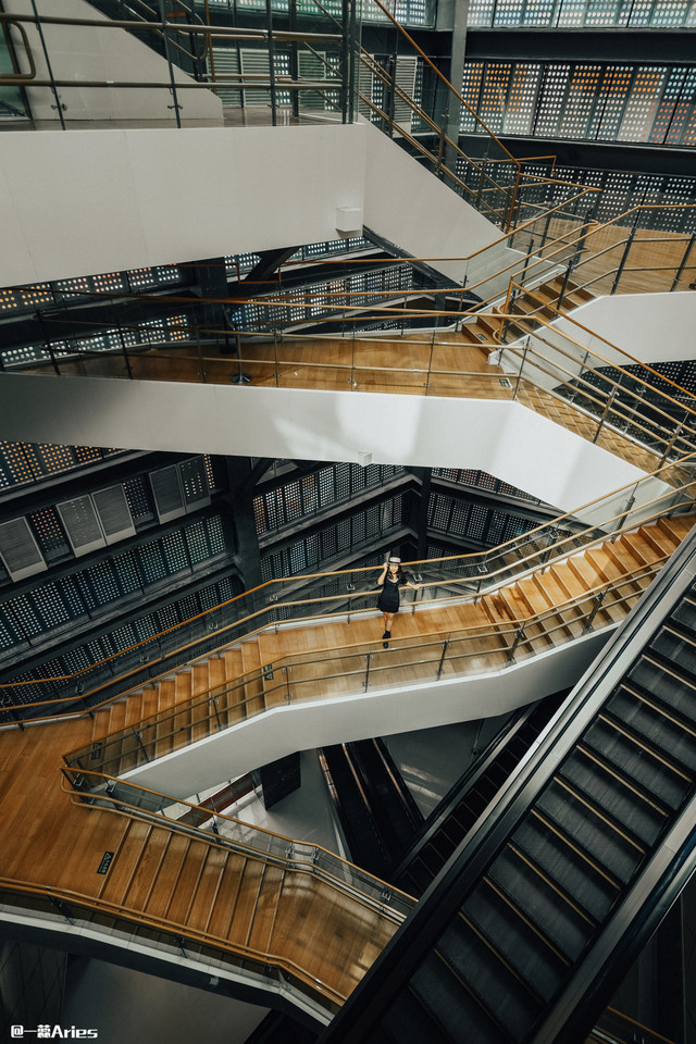 体验完,从中庭的书吧上餐厅用餐,摄影师一眼就相中的这宝地,三角形回旋的楼梯,仿佛是攀登知识高山的道路,颇有设计感。