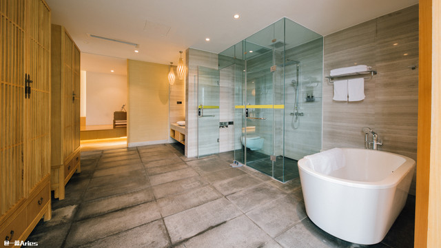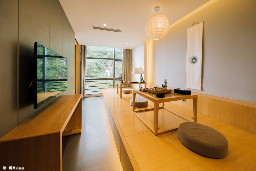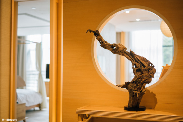 套房的设计简直深得我心!推开门,圆形屏风后分别有三个超大空间,暖黄色的原木基调非常有质感。