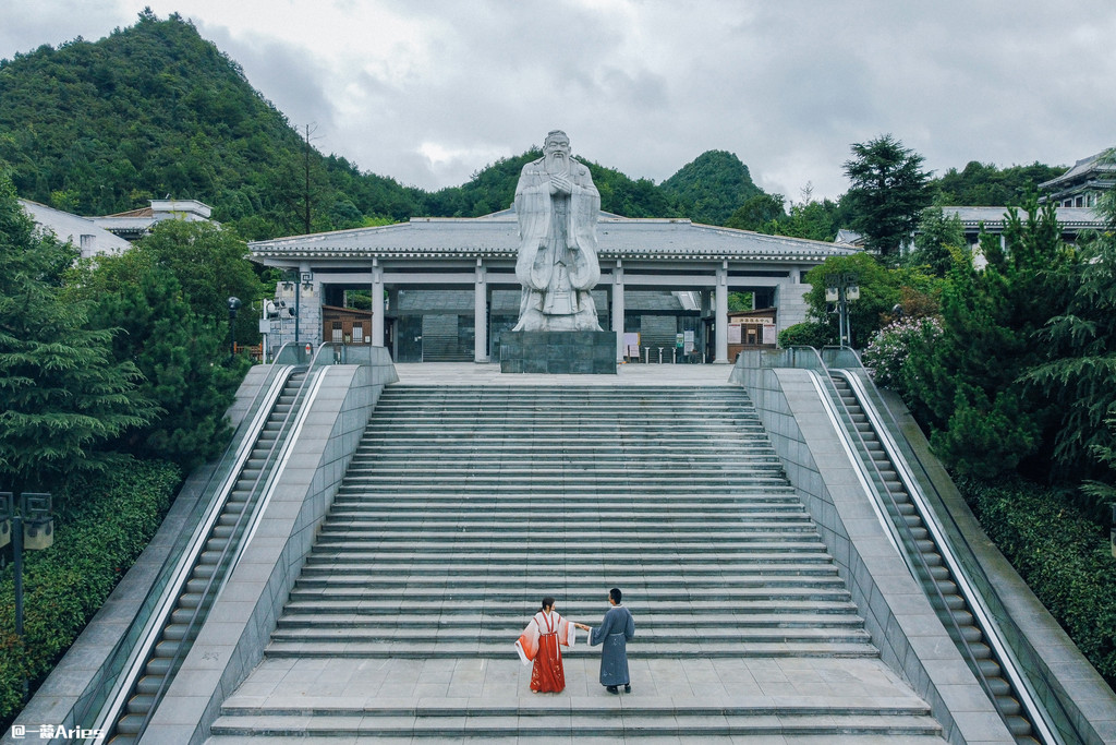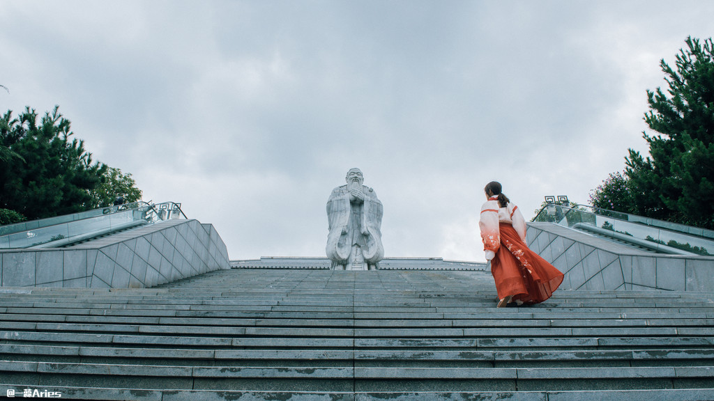 门前孔夫子正在弟子的护卫下周游列国,意气风发的样子颇有些高大。而想要瞻仰9.28米的孔子雕像,则需要登上百米的楼梯,才能抵达。