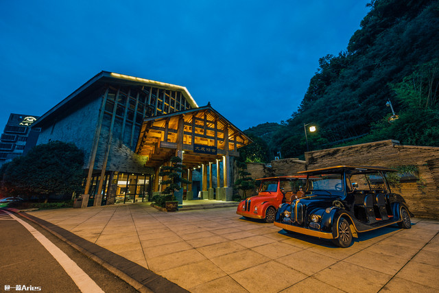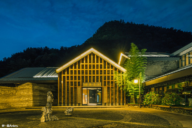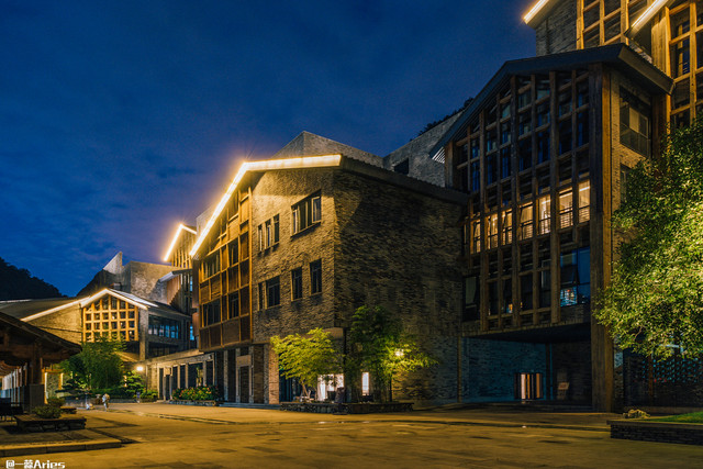 泛蓝的光线映衬着酒店暖黄色的微光,构勒出屋檐的形状,依山势起伏的客房和大厅,不论是大环境还是小细节,都讨人喜欢。