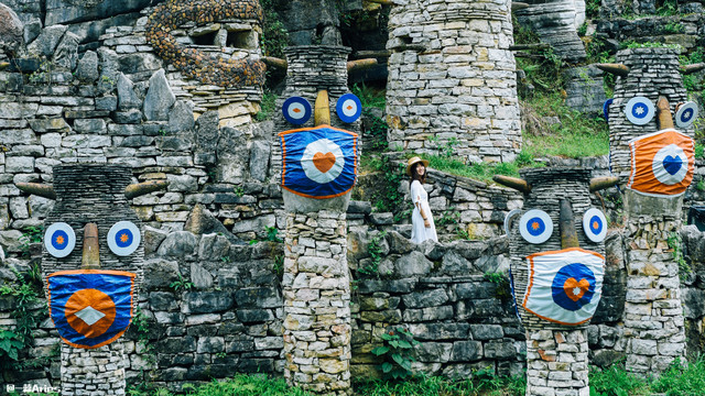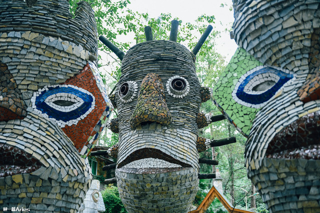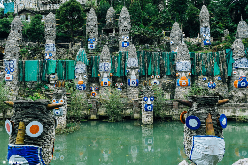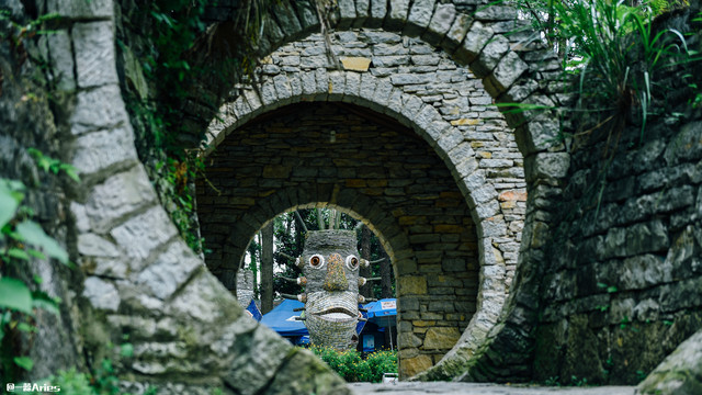 整个景区规模不大,从密林的幽径拾级而上,穿过石块堆砌的拱门,道路两旁是依山而造的石柱,各种表情的石头脸谱直愣愣的盯着到访者,莫名的喜感。