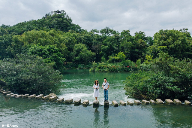 园内最有意思的莫过于百步桥,远看颇有点云水谣的意思,当夏天水流急的时候,踏上那石阶,就好像武林高手在人间,踏浪而来,逐波而去。大人小孩都忍不住童心,要去挑战一番。