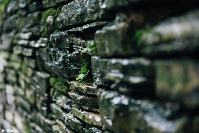 贵州多层岩,层层片石垒起的院墙,颇有质感,这条背街道路狭窄而清幽,沿着山势起伏,青石缝里长满了青苔和野草