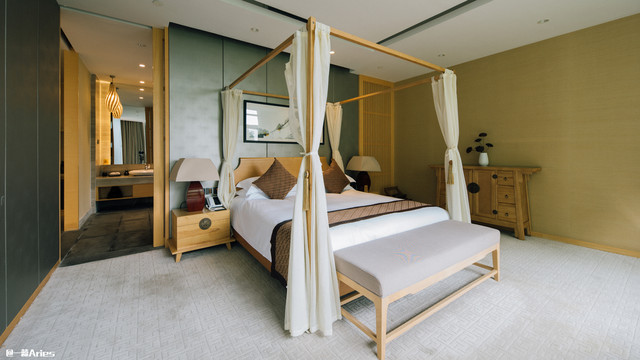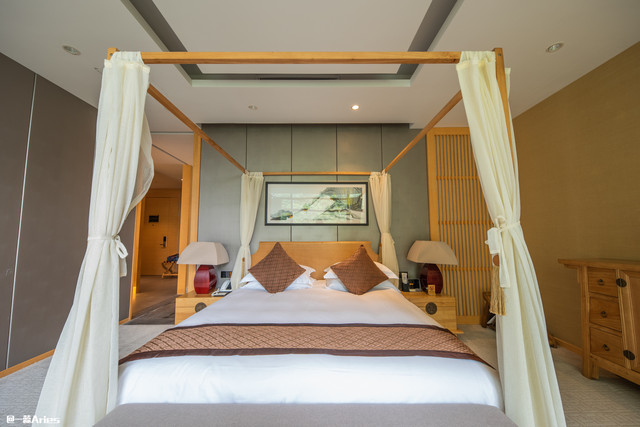 第二间是卧室,凉爽的风从窗外吹进来,超大的落地窗采光良好,两米的木床在巨型卧室里显得特别娇小,新中式的家居设计简洁不简单,特别有品位。在房间里拍了好多照片,感觉可以给爸妈未来翻新老房子做参考。