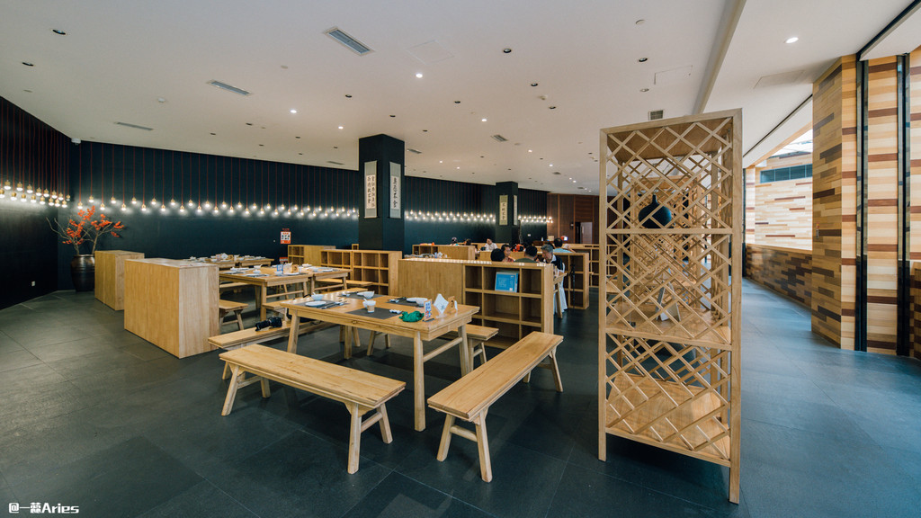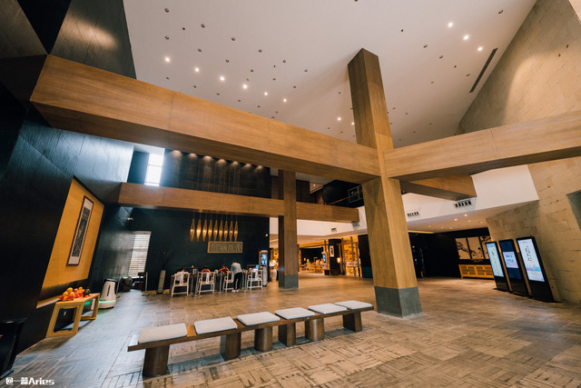 进入酒店大厅,几根巨型木梁交错,沿袭着宏伟的汉唐之风,处处透露出雅致古朴的气息。