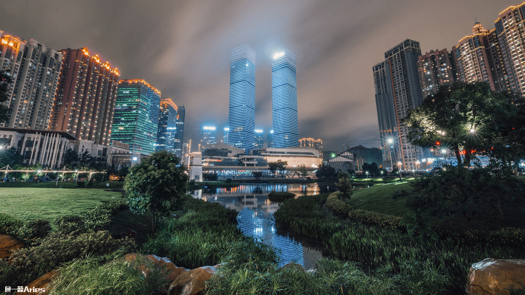 漫步花果园湿地公园,四周高楼大厦环绕,霓虹闪烁,双子塔开启绚丽的灯光秀,淅淅沥沥的夜雨,让绿植更深层,这美不胜收的夜景,令人赏心悦目。