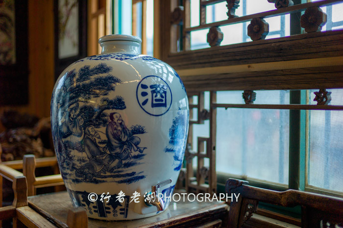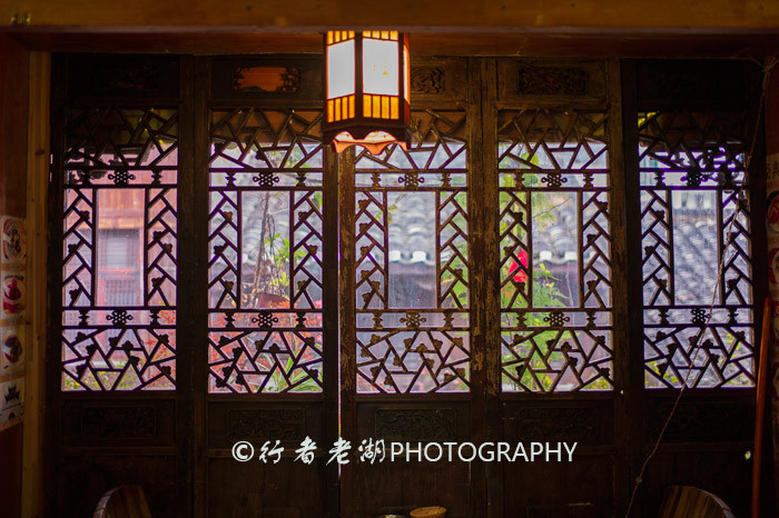 暖和过来,才看窗外的景,桌子上方吊着一个宫灯,边上是老式雕花窗户,透过窗棂,可以看到西街对面的黛瓦老屋。看我在张望,隔壁座先来的那位客人说窗户可以打开,后来老板介绍,他是一位来自北京的游客,是他家的熟客。如果不是冬天,在这儿吃饭,打开窗户,可品味六百多年古镇老街的韵味。