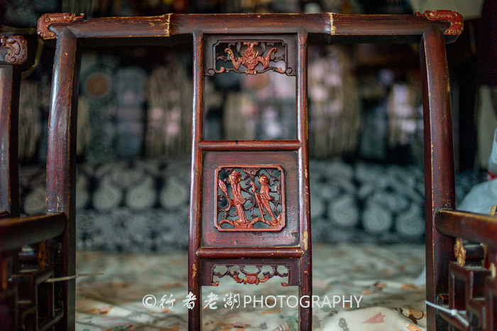 屋里还有几把旧木头椅子,其中两把放在床前,木质靠背的方框雕刻出像是竹节,有一定的弧度,也是木榫卯结构。靠背和四角都有图案,中间的图案像是两位寿星老人,油漆和图案跟老式木床很匹配。有一把椅子座板上的油漆已被磨光,露出木纹,坐在上面硬硬的,但是靠上去腰背却很舒适。