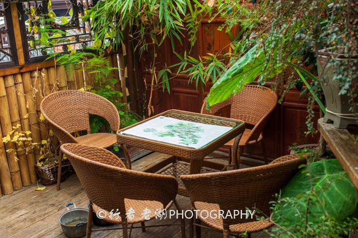 看到他家只三四张小桌子,我问老吴,旺季的餐馆是否经常爆满,他说楼上还有地方。上楼顶一看,感觉进了植物园的大棚,楼顶上种满了花花草草,探出头去,还能看到整条西街,植物掩映之下,一个小木头亭子,摆了张桌子,边上也有座椅,饭后喝茶聊天,可是个“大隐隐于市”的绝妙去处。