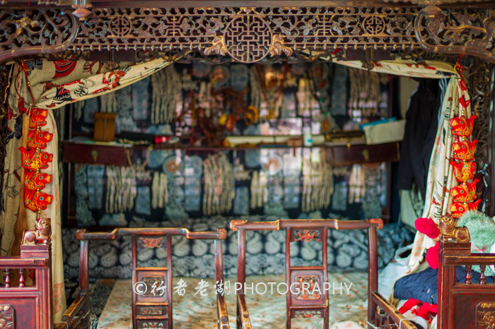 逗完鹩哥,对这家小餐馆更是好奇,四处看看,餐桌边一个古旧的老雕花床和几把木制椅子引起了我的兴趣。记得以前爷爷奶奶家,也有这样的木床,可惜早已经丢弃,这种古老的中式木制床已经不多了,特别是全木榫卯的床架,多半都是清朝、民国之前的古董。老板说这个是他们家祖传的老木床,应该是清朝末期的,平时他们还睡在这张床上。