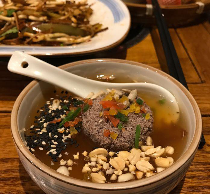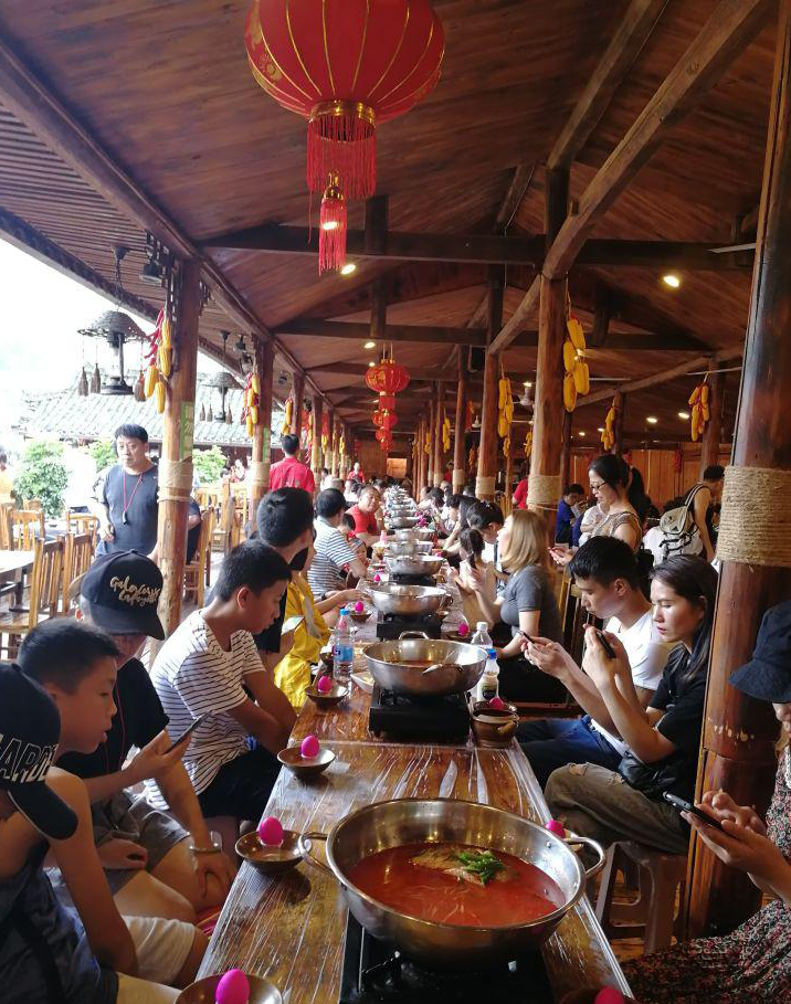 长桌宴——直接找包车师傅预订,60元一人,以酸汤鱼为主,一大群人围着桌子吃饭。说