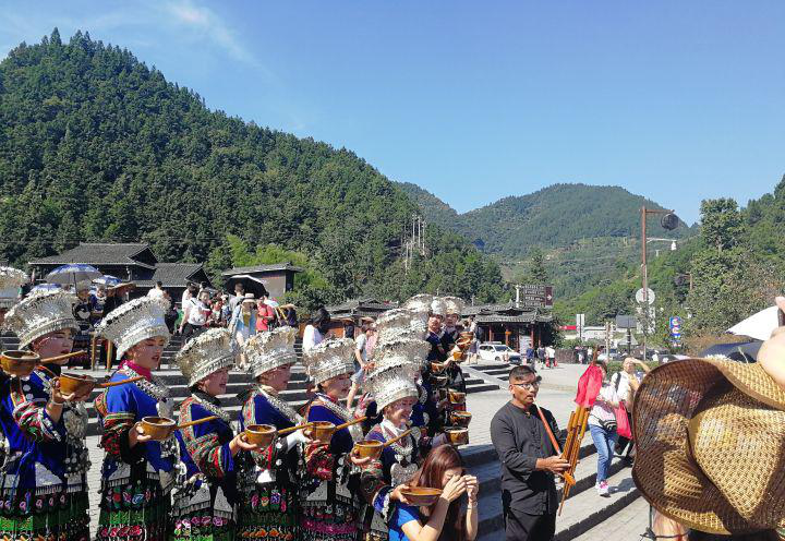 早餐后,前往西江千户苗寨。首先是拦门酒,会看到有漂亮的着苗族服饰的小姐姐,欢迎你,喂你酒,称之为——高山流水。