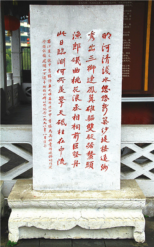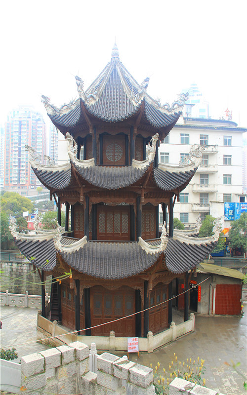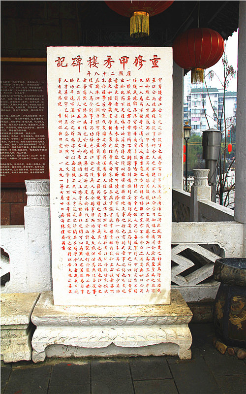 甲秀楼现存建筑是宣统元年重建的。楼上下三层,白石为栏,层层收进,由桥面至楼顶高约20米。