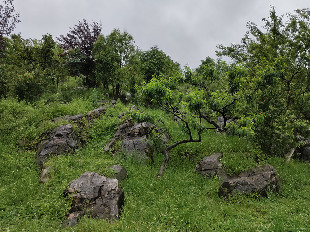 “步步登高”“阳明石书”也是明明白白标示的景点,还有很多看着似是而非的石块,我们一路走一路也给开玩笑似地起了很多个名字。雨下得有些大了,小伙伴对其中的一片石景大感兴趣,逡巡不肯离去。我四下张望,找到了一个石洞,居然还能躲个雨呢!不过,头顶上还是有个洞,雨淅淅沥沥地往下落,不过还能找到避雨的角度。
