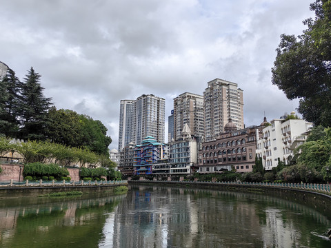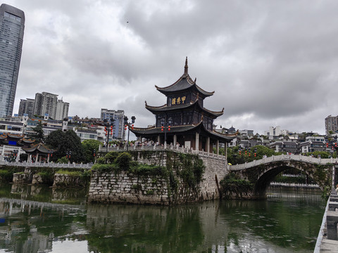 从民族博物馆出来,旁边就是南明河。南明河蜿蜒横穿贵阳市区,既是长江上游的一条重要支流,也是贵阳的“母亲河”。沿河西行大概八九百米就是甲秀楼了。
