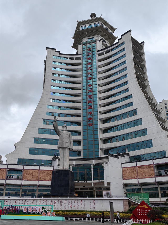 贵州省民族博物馆位于南明河畔,比邻筑城广场,建筑造型来源于侗族鼓楼的建筑形制,国家一级博物馆,全国第五个省级民族博物馆。博物馆正前方矗立着毛主席雕像,雕像台基墙上刻有毛主席的词作《满江红·和郭沫若》。